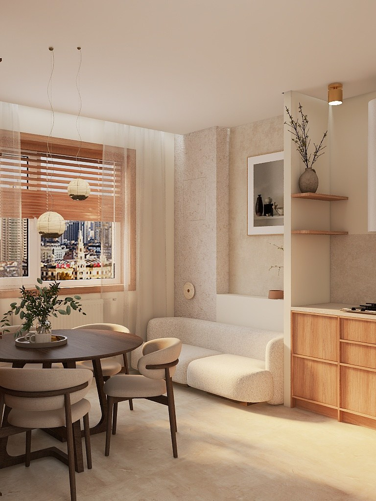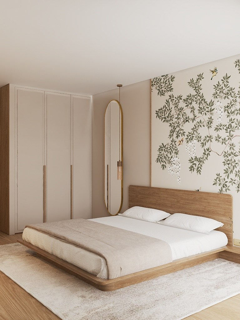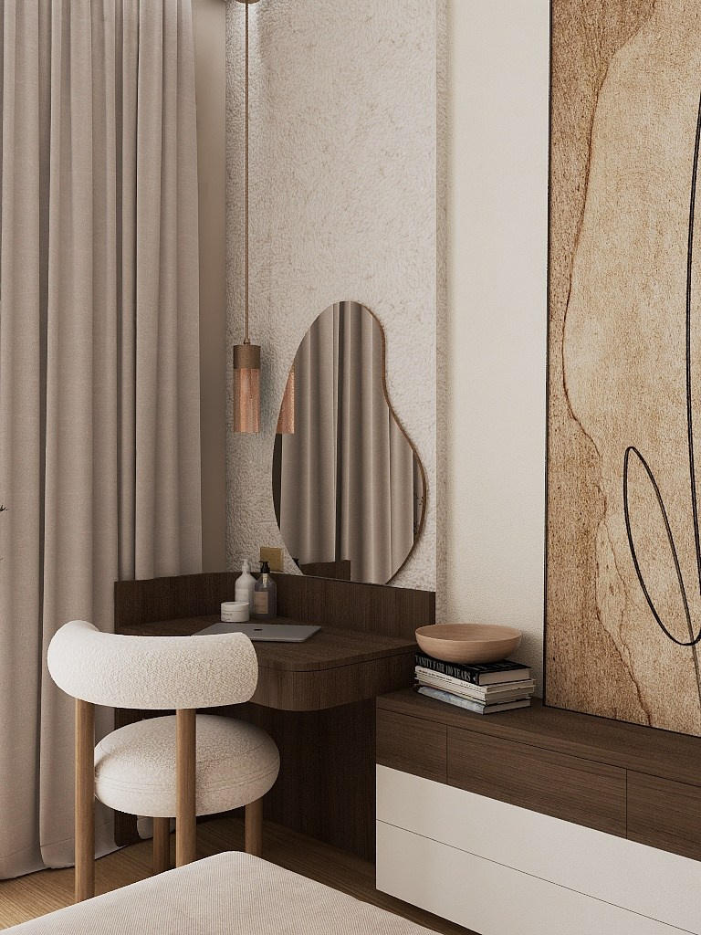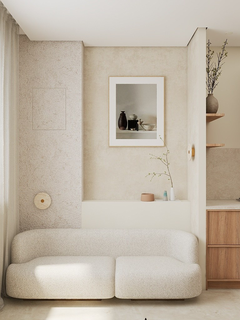 Низкая мебель, сглаженные углы, мягкие ткани и теплые оттенки натуральных материалов отделки и декора создали эффект покоя и гармонии с природой.