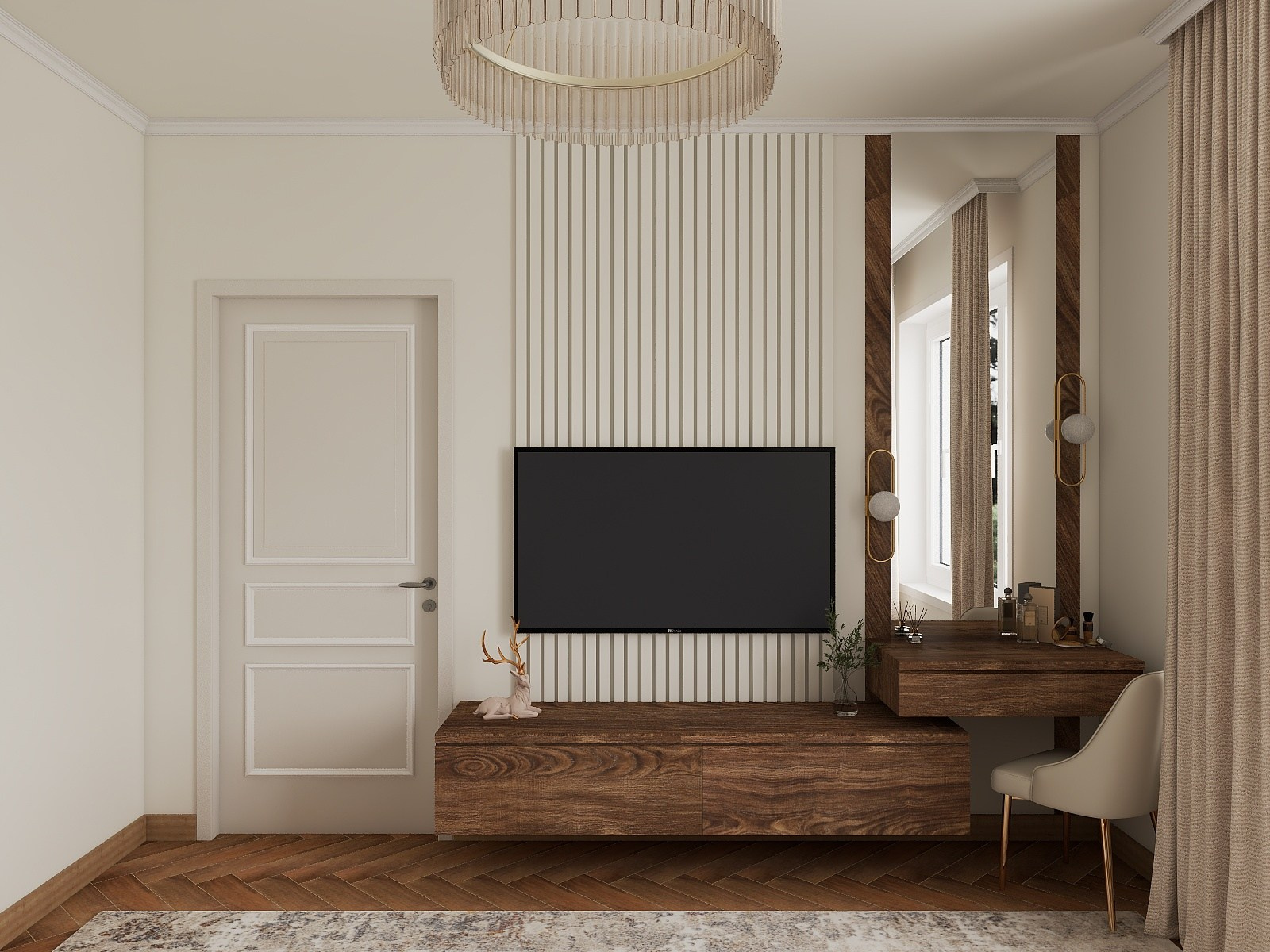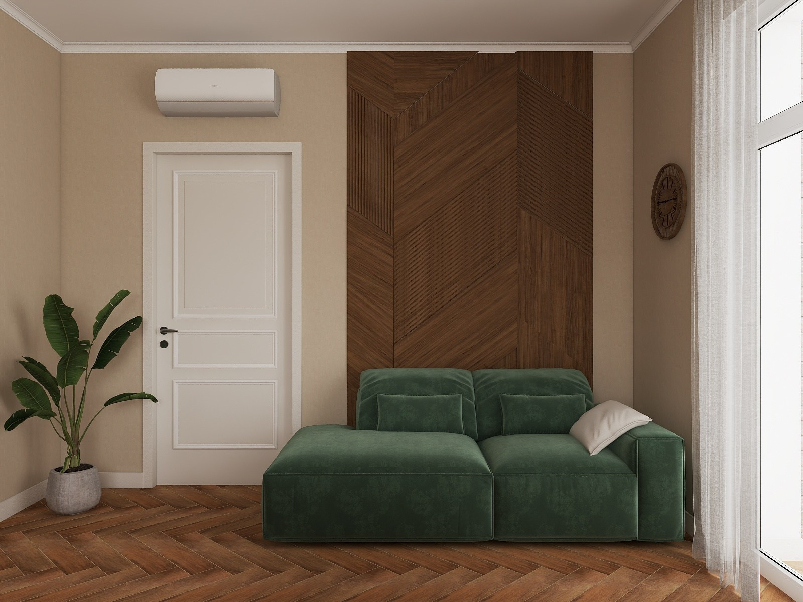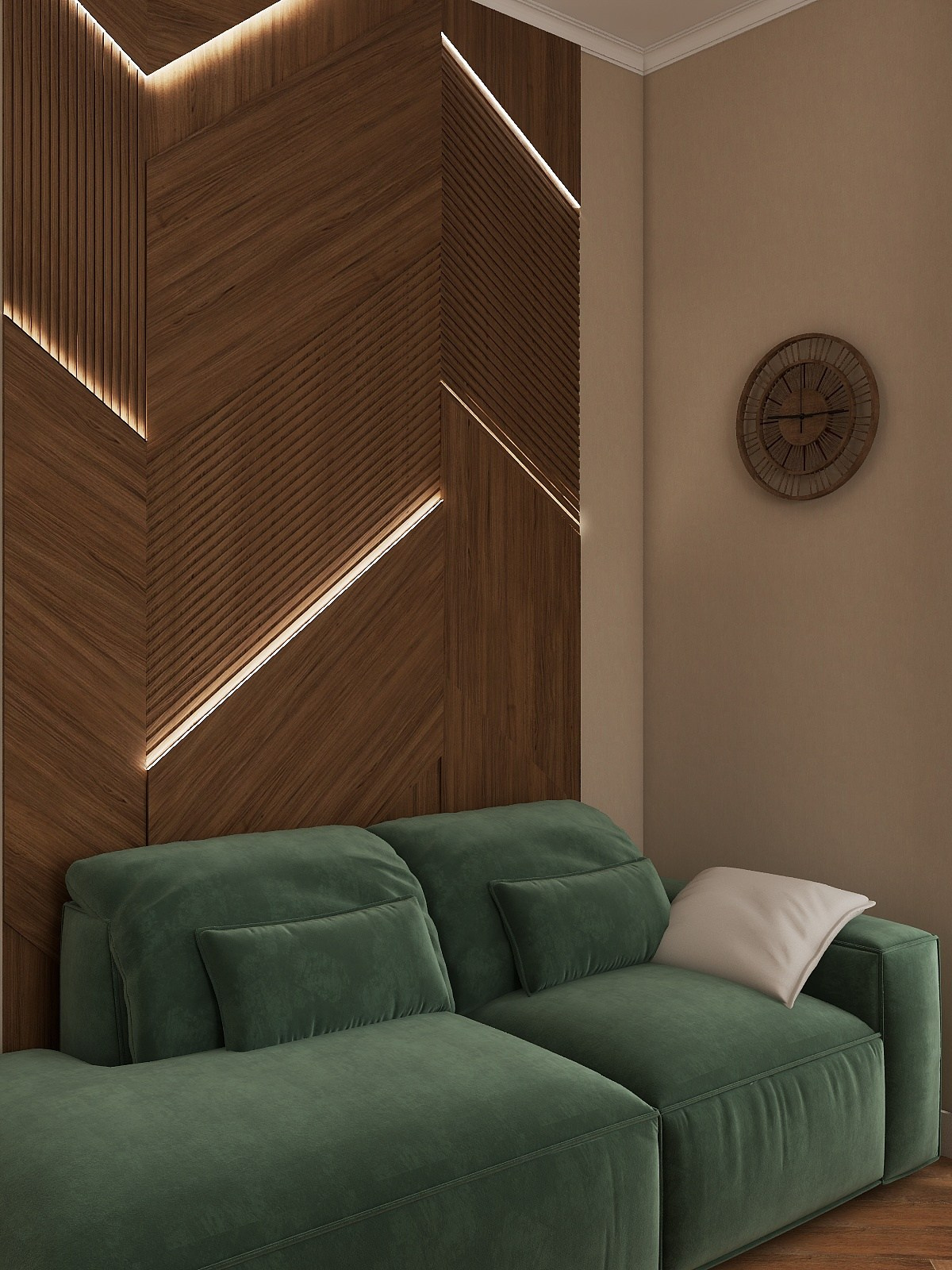 В итоге интерьер решили сделать светлым с акцентными деталями. Заказчикам очень нравятся деревянные панели в интерьере.