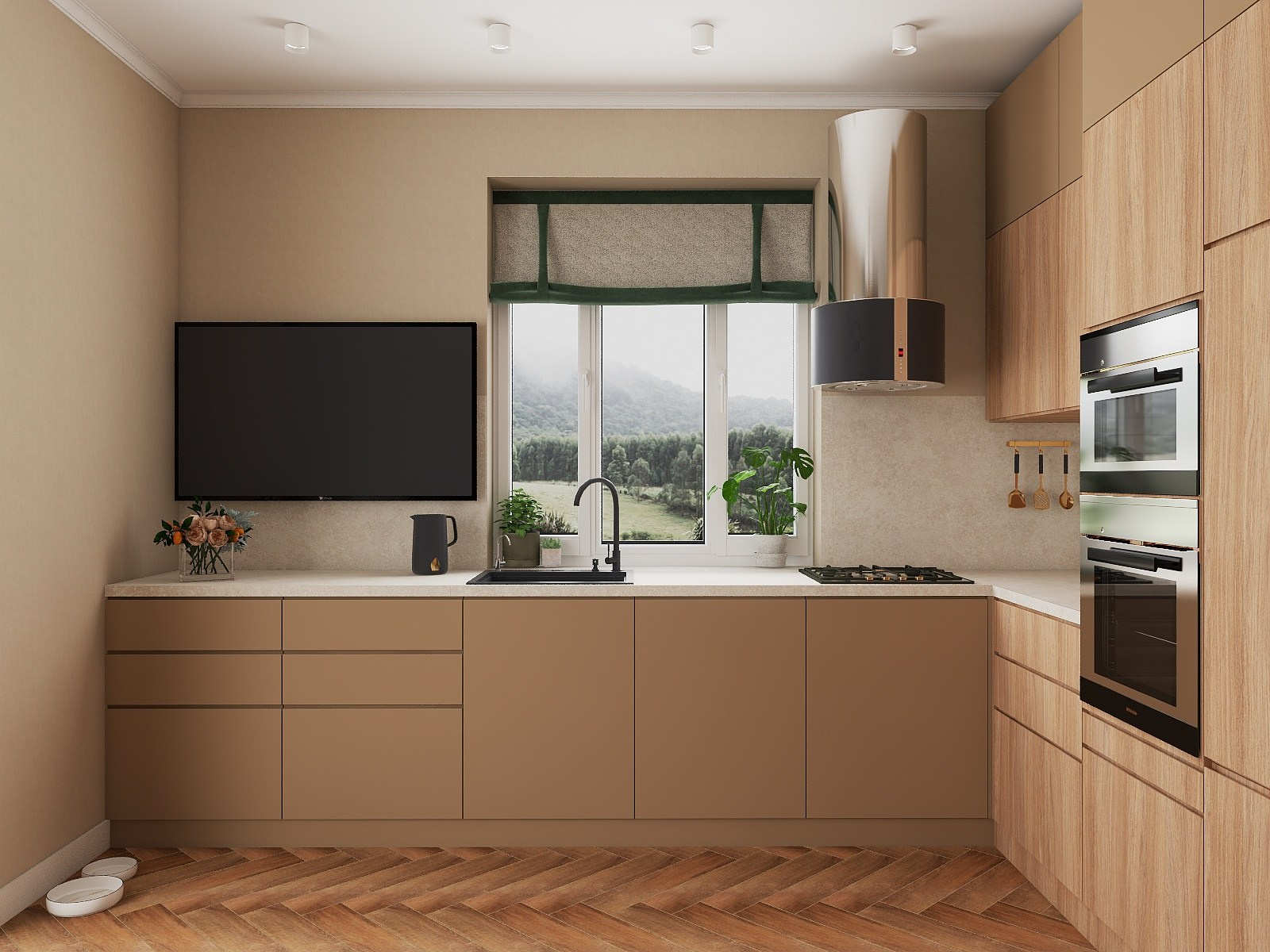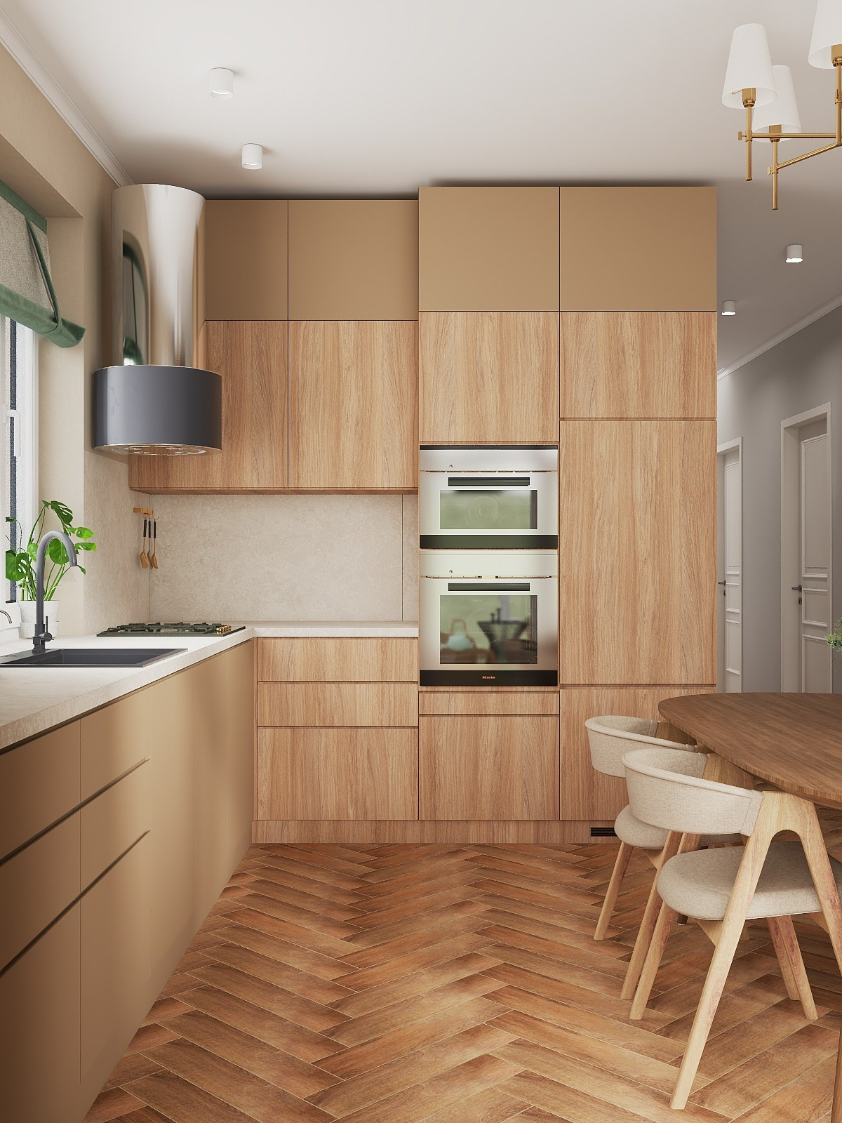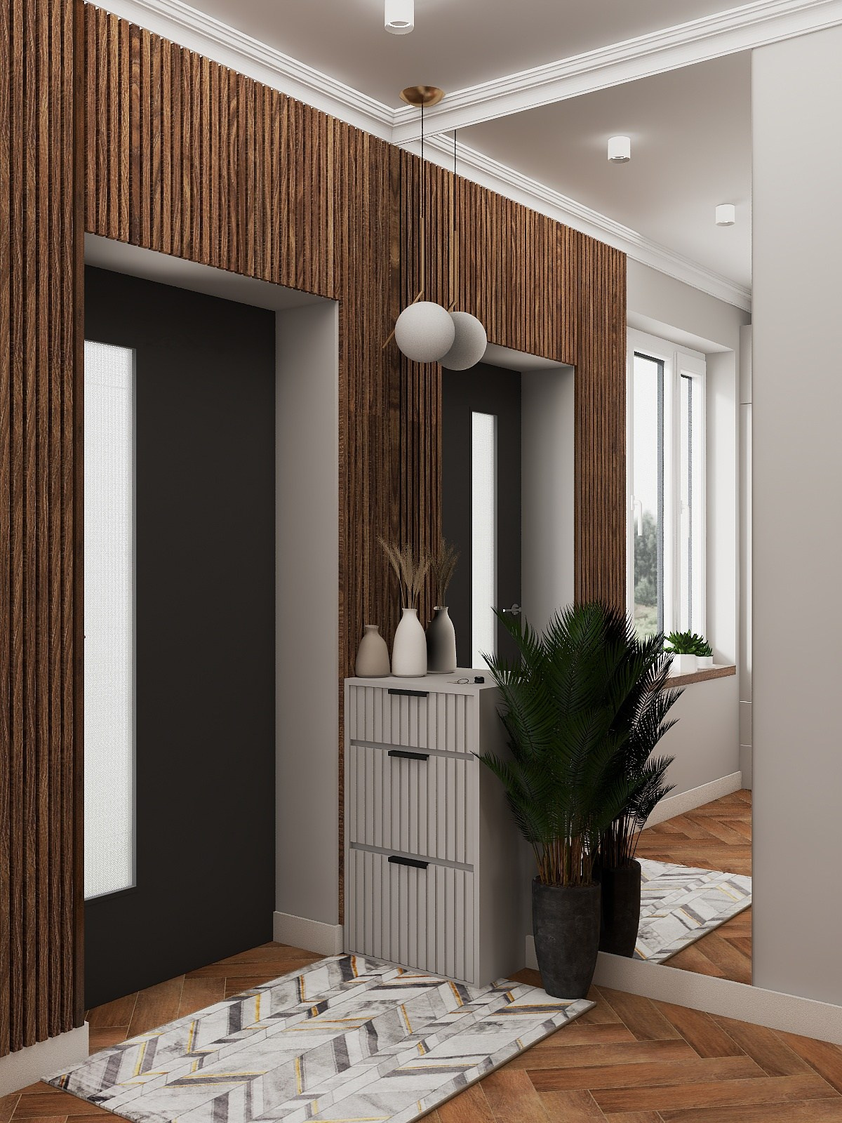 Прихожая задаёт общий тон пространства, наполненного теплом дерева, мягкими тканями и уютными оттенками.